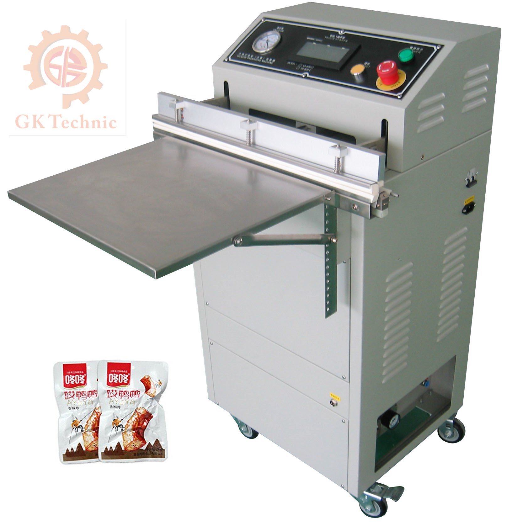 六、当达到设定的热封时间后,热封指示灯熄灭,看到热封结束,即真空室通过电磁阀进入大气,直到机罩自动升起,真空充气包装过程结束,下一个包装周期已经准备好了。