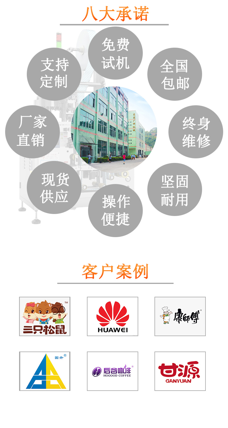1.彩色触摸屏和稳定可靠的双轴高精度输出的PLC控制,制袋、计量、充填、封合、打码、切袋一次完成。