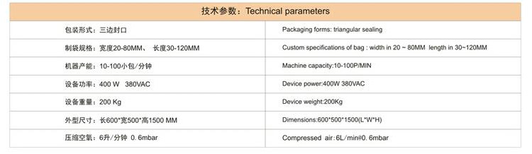 1.彩色触摸屏和稳定可靠的双轴高精度输出的PLC控制,制袋、计量、充填、封合、打码、切袋一次完成。